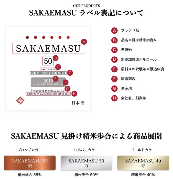 • SAKAEMASU(榮万寿)の歴史は、新潟から始まります。初代は、美味しい水を求め、新潟発祥の酒造好適米「五百万石」と共に群馬県館林市にたどり着きました。諸事情により一時休蔵しましたが、 日本酒ファンと新価値の創出のため、6代目の手によって2010年に蔵を全面改装し、 2つのヴィンテージ日本酒「SAKAEMASU 55」「SAKAEMASU 50」を誕生させました。