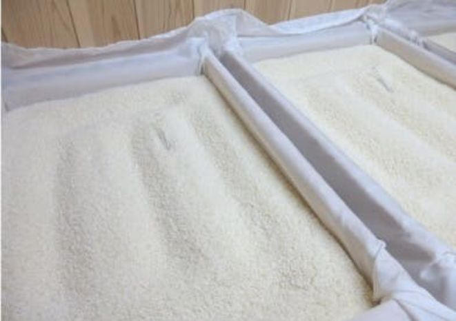 • 麹は「酵素のデパート」とも呼ばれ、様々な酵素を生成します。中でも、最も重要な役割を果たすのが、お米のデンプンを液化させる「液化酵素」と、液化したデンプンを糖に変える「糖化酵素」の2つです。この2つの酵素のバランスが、酒の味わいを大きく左右するため、麹造りは非常に慎重に行われます。私たちは、この大切な麹造りにおいて、伝統的な「箱麹法」を採用しています。この方法では、細やかな温度管理を徹底しながら麹菌の繁殖を促し、最高の麹米を育て上げます。手間ひまを惜しまず、一つひとつ丁寧に作られた麹が、私たちの酒に豊かな風味と深い味わいをもたらします。