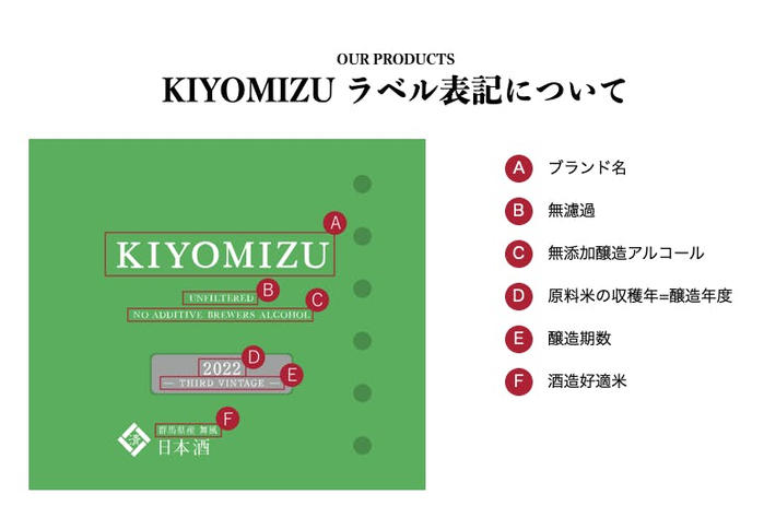 ブランド名の由来は、社名である清水屋酒造の一部「清水」に由来しています。澄んだ水の清らかさを目指した酒質を表現するため、「きよみず」と読みます。また、日本のお酒であることを重んじて、和名の訓読みで名付けられました。